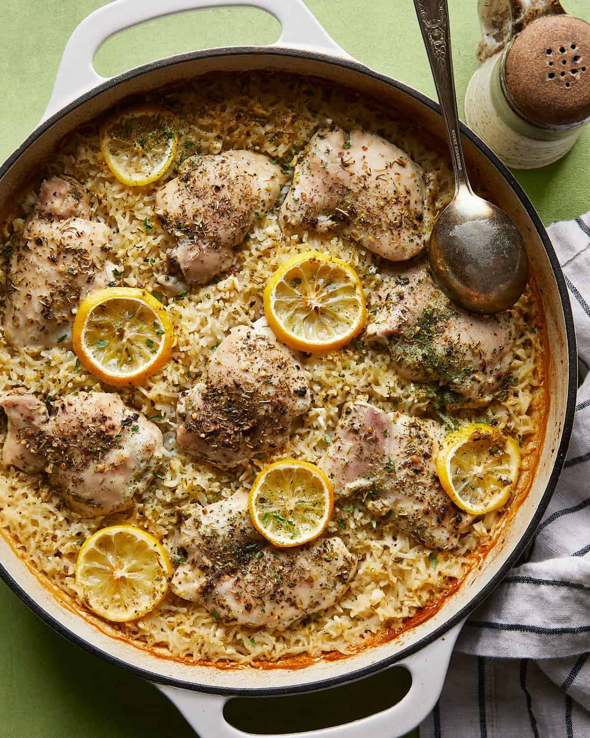 - Add Chicken, Liquid, & Butter: Nestle the chicken thighs into the rice mixture in a single layer. Season the chicken with the remaining salt, remaining Italian seasoning, and additional black pepper. Pour the warm chicken broth into the dish around the chicken, being careful not to wash off the seasoning. Evenly distribute the cubed butter and, if using, arrange the lemon slices over and around the chicken.1 1/2 pounds boneless skinless chicken thighs, 1 3/4 cups chicken broth, 1 lemon,, 2 Tablespoons unsalted butter,