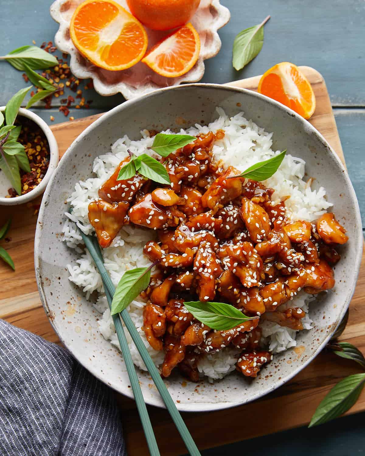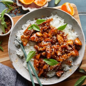 Skip the takeout and make this Easy Orange Chicken Recipe right at home! It’s sticky, sweet, tangy, and packed with flavor from fresh orange juice, ginger, and garlic. The bite-sized chicken thighs cook up juicy and golden, then get tossed in a glossy homemade orange glaze that tastes even better than your favorite restaurant version.